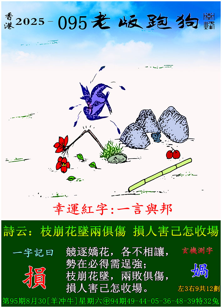| 主题 :095期老版跑狗一字記之曰:【損】 玄機測字:《媧》 |